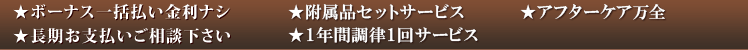 | ピアノはアフターサービスの大切な楽器ですから、優れた技術スタッフの 揃ったピアノ専門店を選ばれることが重要なポイントです。 |