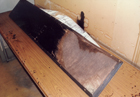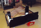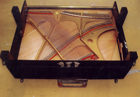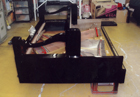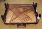 | ピアノを寝かせて底板と 前戸台(ペダルの窓が ある部分)をはずした所 |